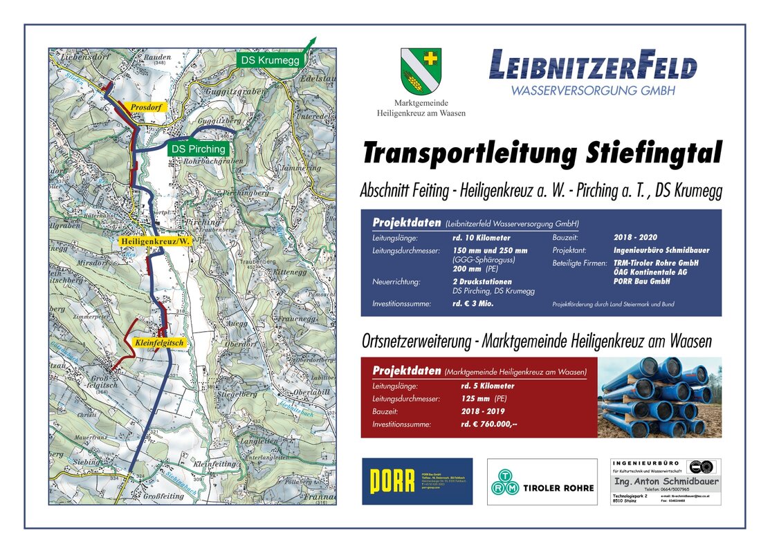 Der symbolische Spatenstich am 15. März in Kleinfelditsch war der offizielle Startschuss zum Wasserleitungsbau im Stiefingtal. Bürgermeister Franz Platzer und Franz Krainer, GF der Leibnitzerfeld Wasserversorgung GmbH enthüllten Ihre Pläne und stellten das Projekt vor.